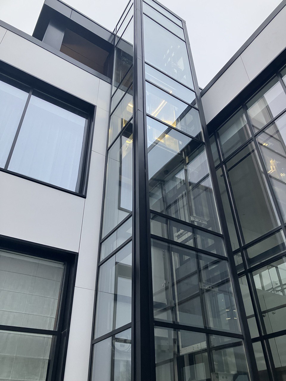 Инженеры «Траст-Лифт» запроектировали металлокаркасную шахту с остеклением специальным триплексным стеклом. Заказчик захотел именно приставную шахту с двумя остановками лифта – на первом этаже и на крыше. Лифт одной стороной примкнул к несущей стене дома, а внешний металлокаркас обшили закаленным стеклом, обеспечив возможность панорамного обзора.