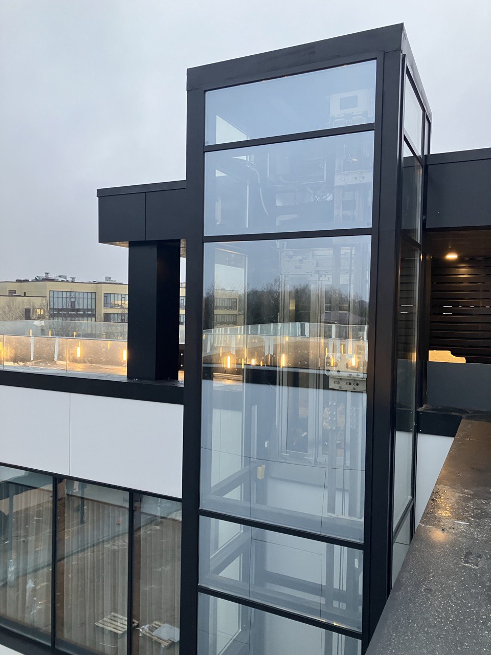 Инженеры «Траст-Лифт» запроектировали металлокаркасную шахту с остеклением специальным триплексным стеклом. Заказчик захотел именно приставную шахту с двумя остановками лифта – на первом этаже и на крыше. Лифт одной стороной примкнул к несущей стене дома, а внешний металлокаркас обшили закаленным стеклом, обеспечив возможность панорамного обзора.